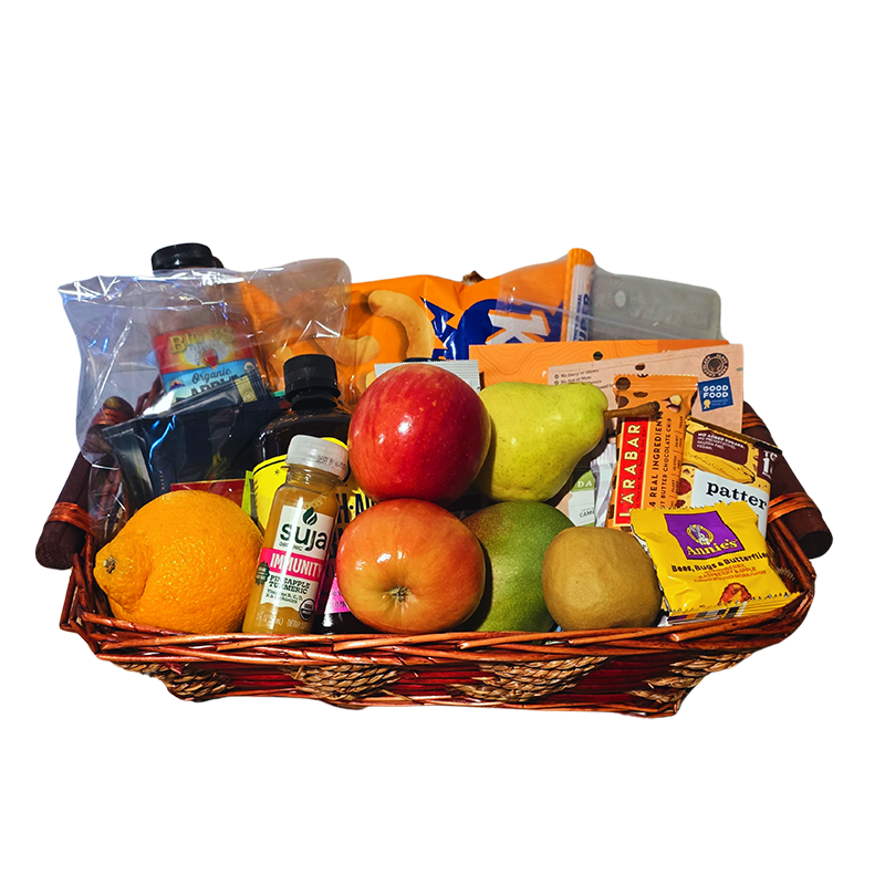Healthy Snack & Fruit Basket with fresh fruit, juice, and healthy bites