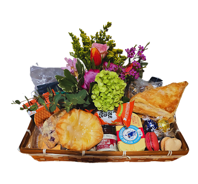 Breakfast Basket with market flowers, fresh fruit, pastries, and European butter