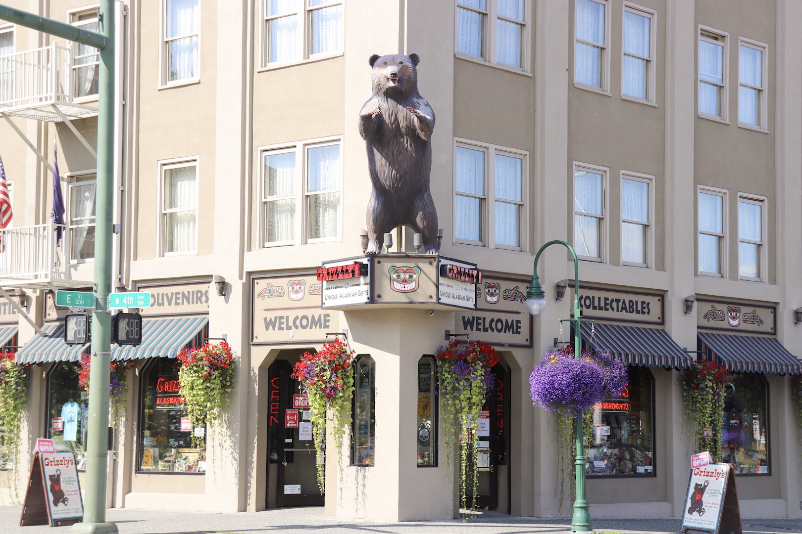 Corner gift shop guarded by a giant bear statue stocking Alaskan-themed souvenirs & clothing.
