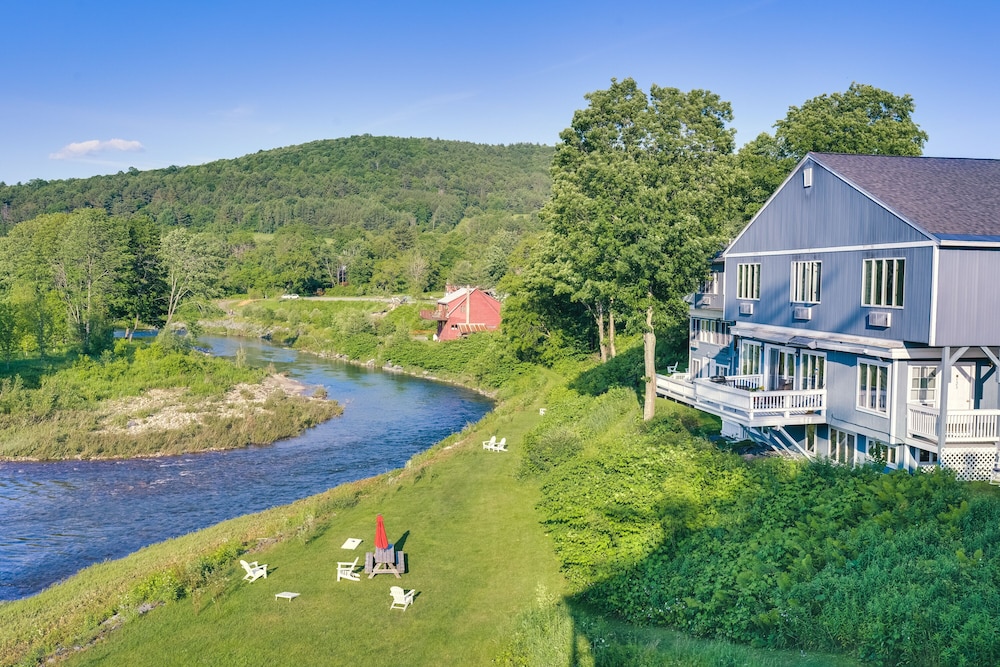 Airy rooms, some with river views, in a bright hotel featuring a wraparound porch & outdoor seating.